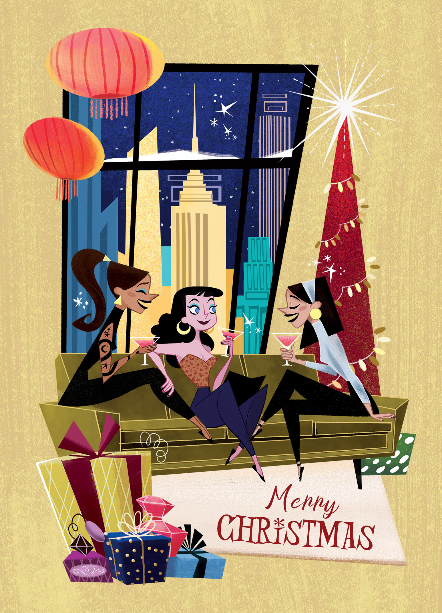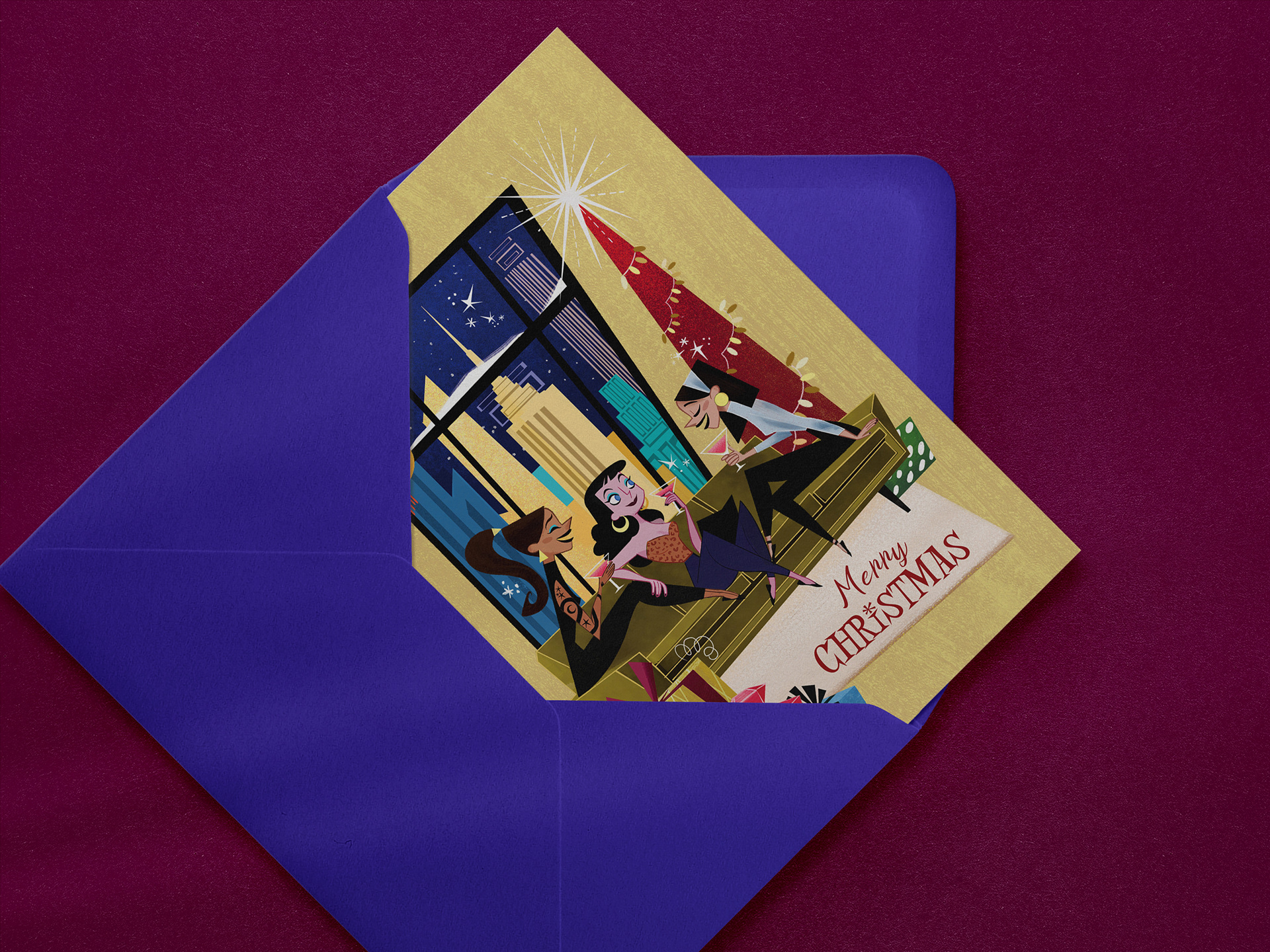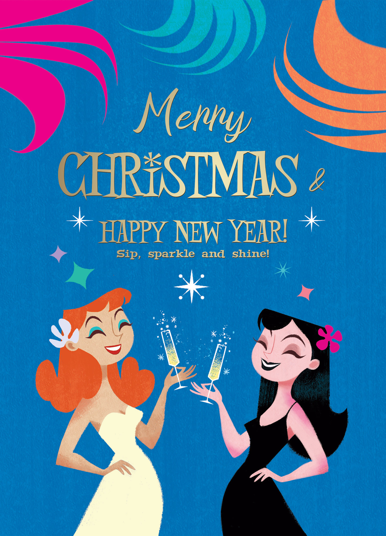 A small collection of two illustrated greeting cards developed around the themes of female friendship, celebration, and holiday moments. The visuals feature a colorful retro-inspired style and expressive characters, creating a warm and joyful seasonal mood.